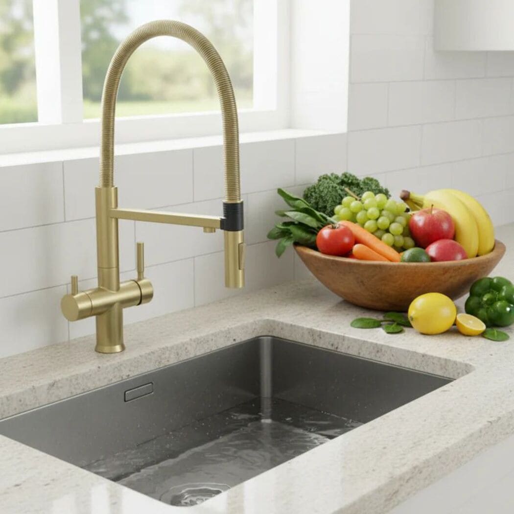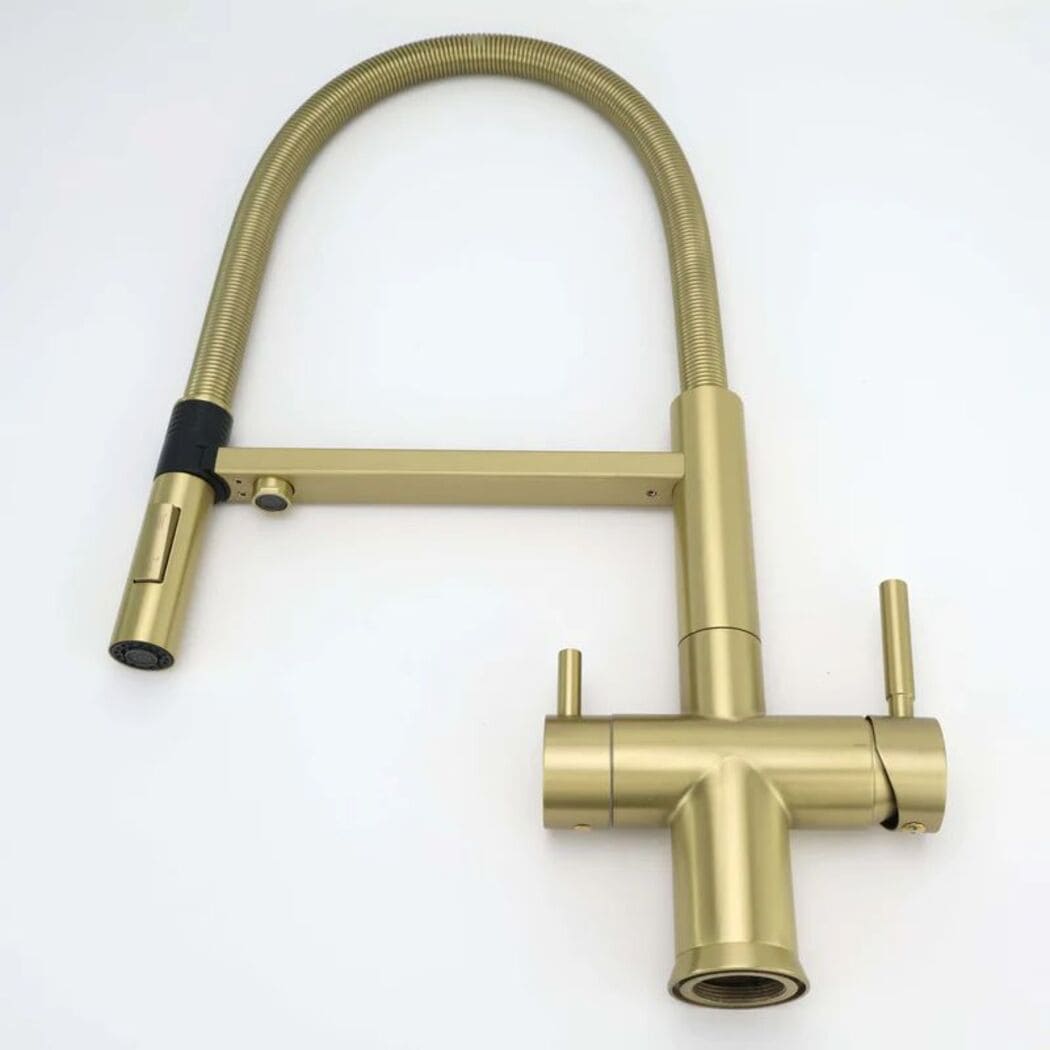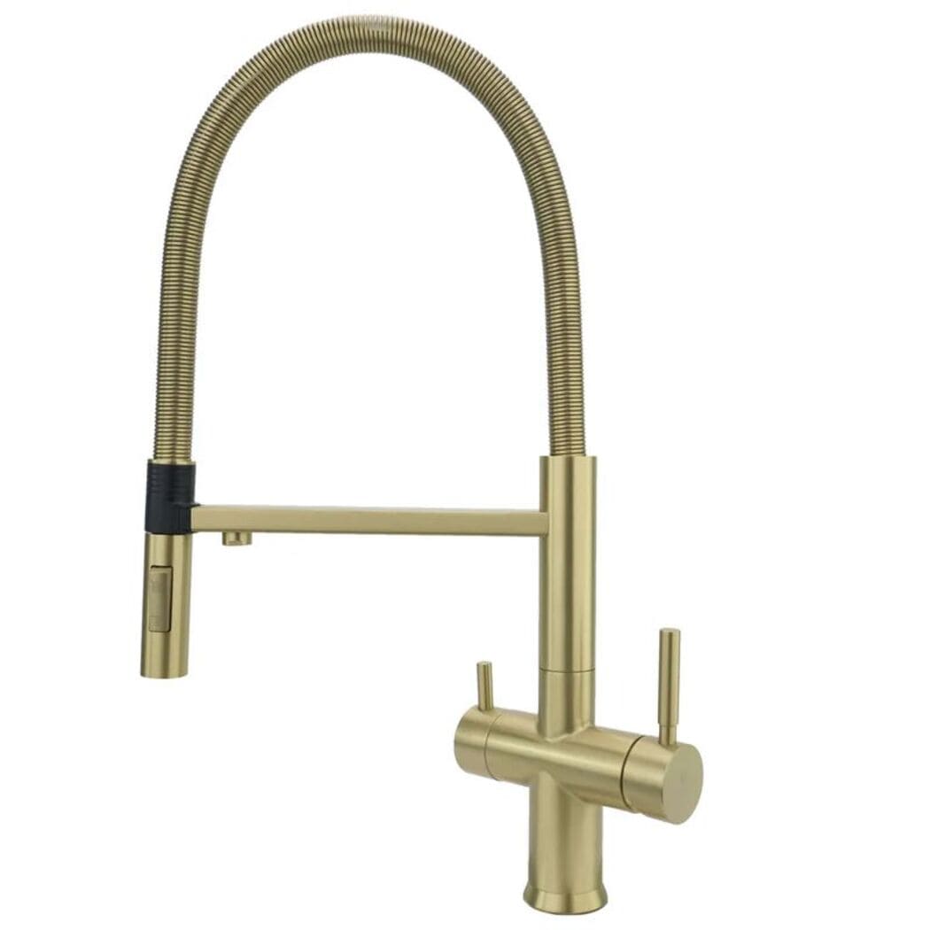 The Riva Brushed Brass, a masterpiece of luxury and innovation, exquisitely designed and meticulously crafted. This pull-out three-way mixer tap redefines elegance, seamlessly blending modern aesthetics with unparalleled functionality. Experience the convenience of dispensing hot, cold, and purified water from a single tap. Elevate your kitchen's opulence with the brushed brass pull-out double-lever 3-way mixer tap, an impeccable choice for those seeking the epitome of sophistication.