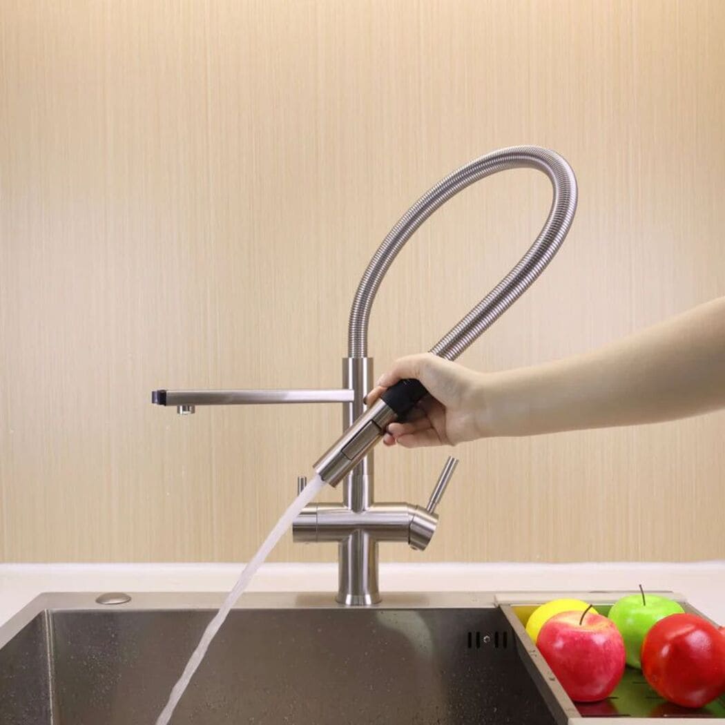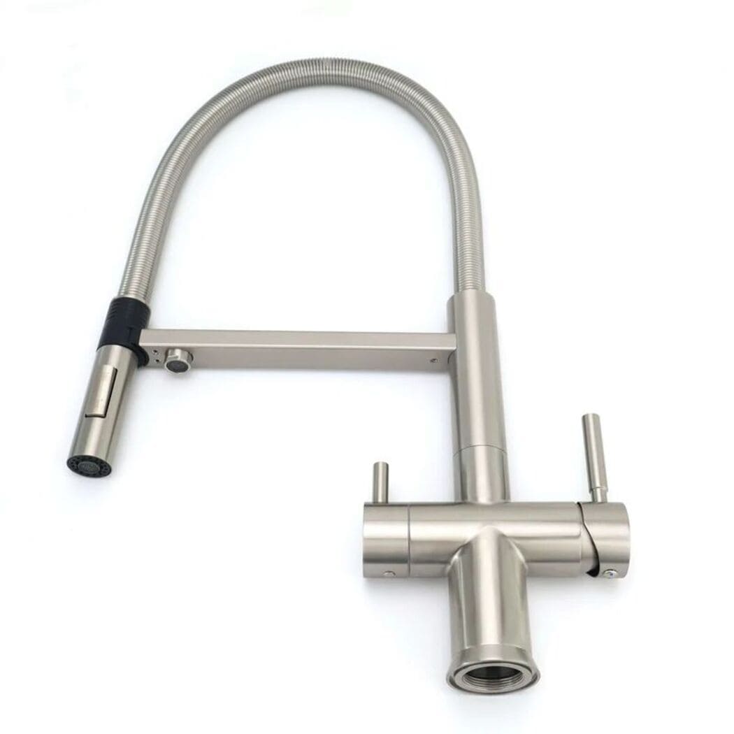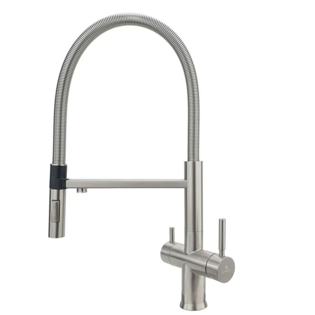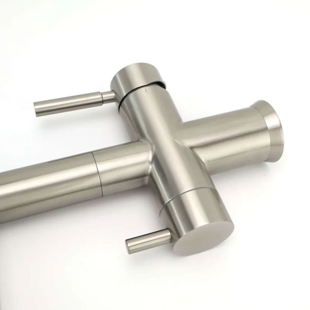 The Riva Brushed Steel, a masterpiece of luxury and innovation, exquisitely designed and meticulously crafted. This pull-out three-way mixer tap redefines elegance, seamlessly blending modern aesthetics with unparalleled functionality. Experience the convenience of dispensing hot, cold, and purified water from a single tap. Elevate your kitchen's opulence with the brushed steel pull-out double-lever 3-way mixer tap, an impeccable choice for those seeking the epitome of sophistication.