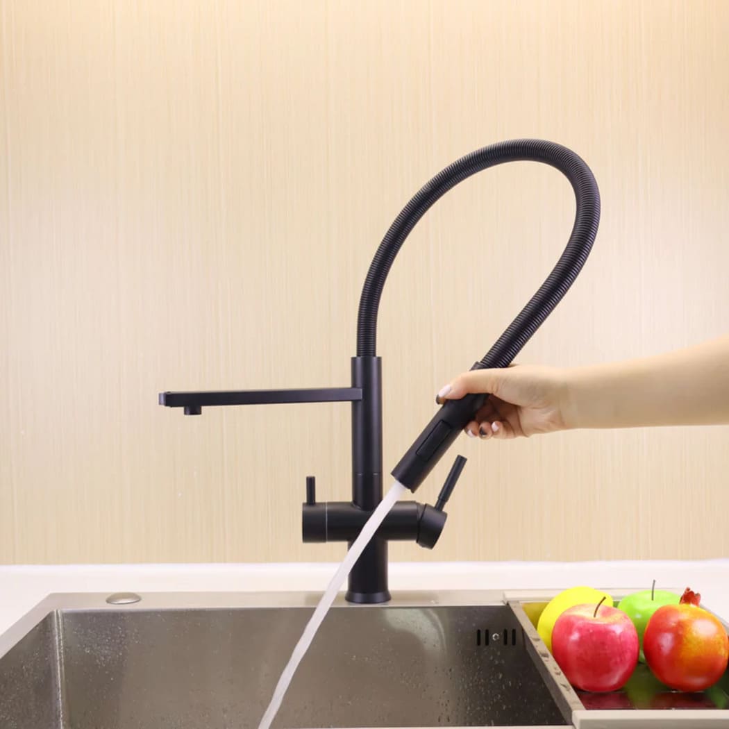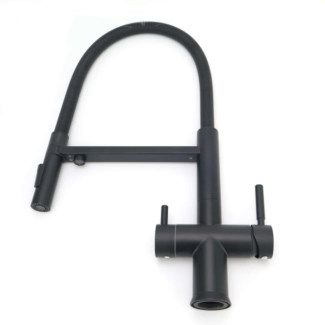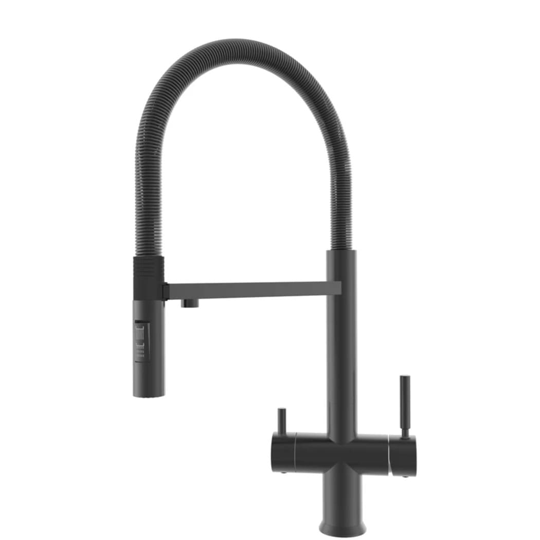The Riva Matt Black, a masterpiece of luxury and innovation, exquisitely designed and meticulously crafted. This pull-out three-way mixer tap redefines elegance, seamlessly blending modern aesthetics with unparalleled functionality. Experience the convenience of dispensing hot, cold, and purified water from a single tap. Elevate your kitchen's opulence with the Riva matt black pull-out double-lever 3-way mixer tap, an impeccable choice for those seeking the epitome of sophistication.
